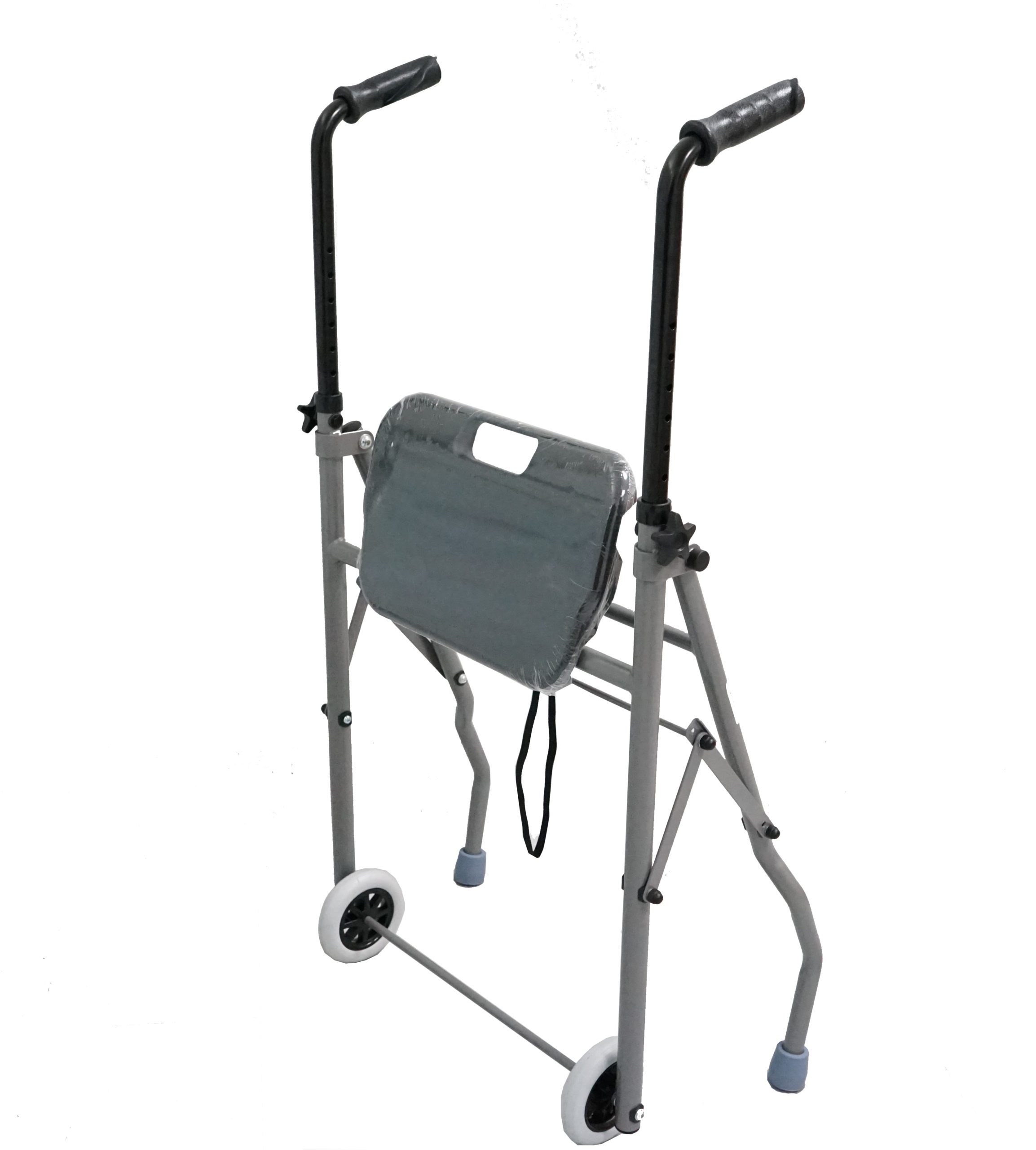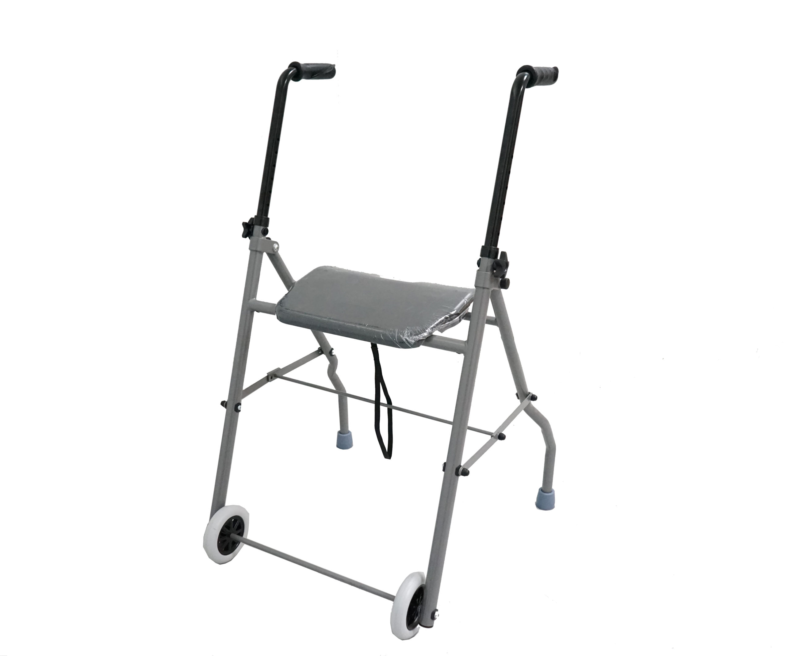 Andador de dos ruedas fabricado en acero inoxidable y equipado con asiento de PVC. Comodidad, ligereza y seguridad para facilitar el desplazamiento incluso en espacios reducidos.